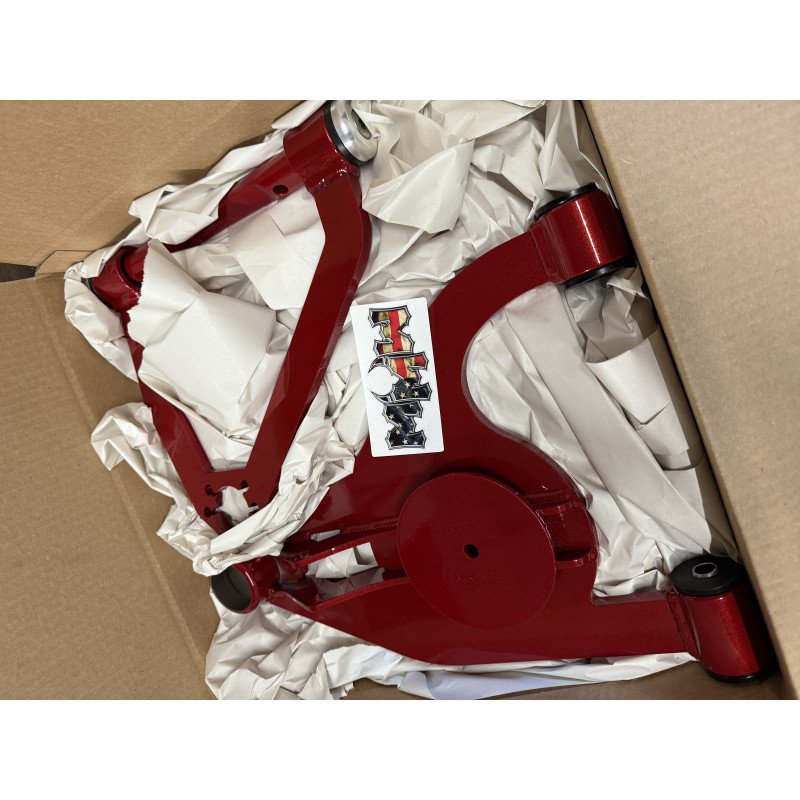 • -Set of Lower Control arms, with bushings, and bolt sleeves, as well as a slotted adjustment lower bag mount, and lower shock mount built into the arm.