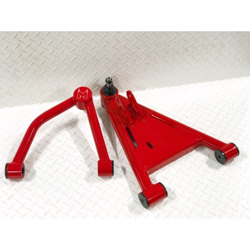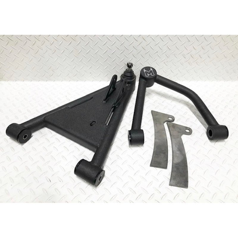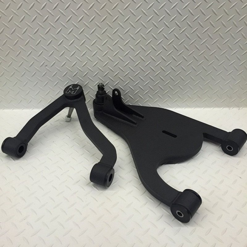 All the options for this control arm package are located to the right of the screen.   Upgrading to Tube Construction automatically gives you Jeebus Joints , so please do not select both!  Arms that are made only 1.5" longer then stock ARE NOT possible for tube construction, the jigs will not allow it. Arms longer than 1.5" wide per side convert to a K6117t ball joint, and will require a small amount of reaming to the lower ball joint flange on your spindle.  Frame modification MAY be necessary around the mounting ear area on for the upper control arm, and for the inboard shock placement, minimal would be required, but it will depend on the length you choose as to how much will be necessary to get necessary fitment and lift.  Coil over arms are ONLY available in flat plate version, NOT tubular and will require use of Ride Tech brand coil overs with the single 1/2" through bolt lower mount, and are setup for a standard amount of 2" drop spindles and a 6" drop overall up front (spindles and coil overs combined)  If you are not going that low, please note that in your order so we can adjust accordingly. Steering conversion kit consists of new inner sleeves made for the Pre 94 tie rod ends, that will adapt your steering to your new track width with the arms you select.  Ball Joint cup modification may be necessary for wheel sizes smaller then 18" depending on wheel offset, and arm lengthen amount, please address this need  BEFORE ordering or powder coat.  Due to the number of options and variables considered when construction these arms, your received product may not reflect what is pictured on our wesbsite at all times, as we frequently are improving design and style to make the arms stronger and easier to produce.  for any questions, please feel free to email us at info@michiganmetalworks.com