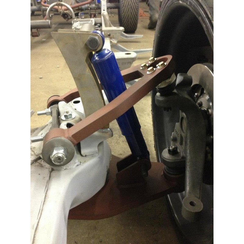 We offer this conversion package in two main versions, Jeebus Joint version (Pictured as black)  and Budget Version (pictured as red).  The Jeebus Joint version will use our extremely strong and versatile custom upper pivots as a replacment for a standard ball joint, giving you a much longer life span, and a joint that is designed for suspension travel.  The budget version uses standard K5208 Ball joints as the upper pivot.  Each set comes with the following features standard: